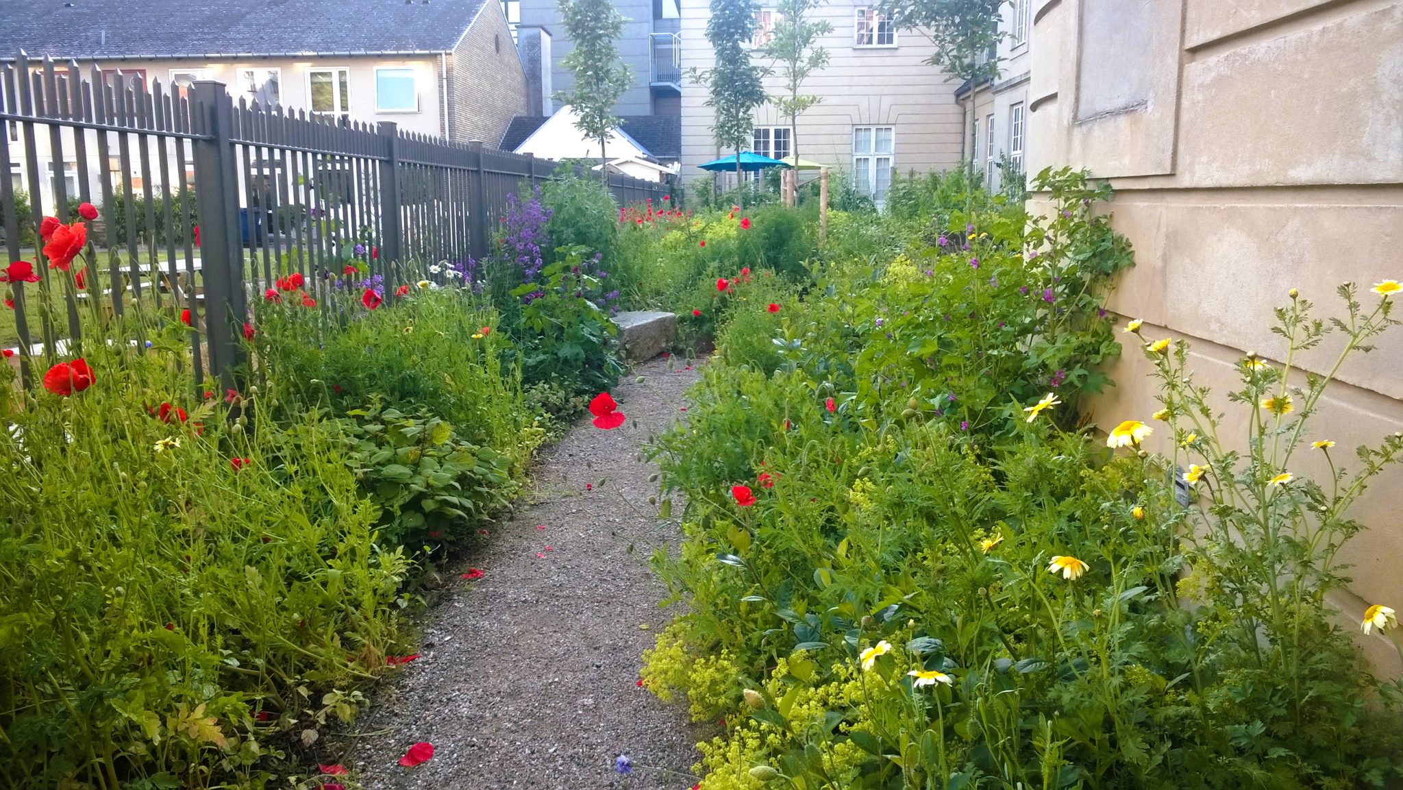 Ved det tidligere Bymuseum etablerede vi sammen med en amerikansk kunstner, og folk med forstand på insektvenlige planter, en have med et vildt udtryk, espalier til vinplanter, regnvandsbassin samt kampestensmure.